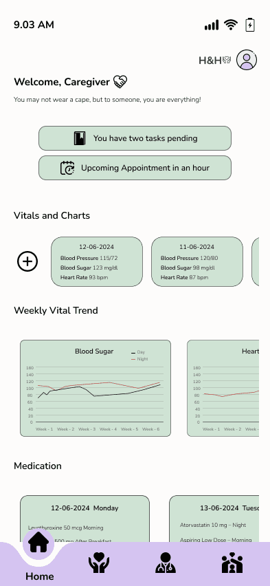 Hold & Heal redefines caregiving support by blending intuitive design and emotional intelligence into a comprehensive solution. Its minimal, calming interface ensures that caregivers can quickly access vital information such as health trends, medication schedules, and doctor appointments, all in one place minimizing stress during their already demanding routines.